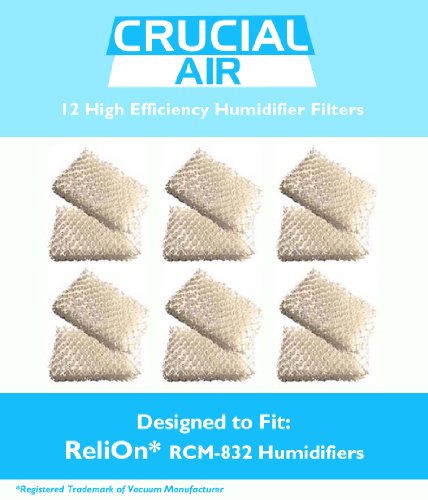 This is a high quality 12 PK Wicking Humidifier Filters Designed To Fit ReliOn Humidifier models RCM832 (RCM-832) RCM-832N, DH-832 and DH-830. Compare To Part # WF813. These filters are designed for "wicking" moisture from a water reservoir into the air. Wicking filters must be clean in order for them to work properly, so it is recommended to replace your filters every 1 to 3 months for optimal performance. Absolutely essential for allergy sufferers. Designed & Engineered By Crucial Air.