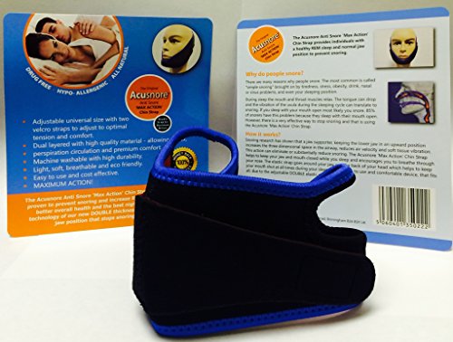 Snoring research has shown that a jaw supporter, keeping the lower jaw in an upward position increases the three dimensional space in the airway, reduces air velocity and soft tissue vibration. This action can eliminate or substantially reduce snoring. The Acusnore 'Max Action' Chin Strap helps to keep your jaw and mouth closed while you sleep and encourages you to breathe through your nose. The elastic strap goes around your jaw and the back of your head which helps to keep your mouth shut at all times during your sleep. It is an easy to use and comfortable device, that fits all, due to the adjustable DOUBLE elastic strap.