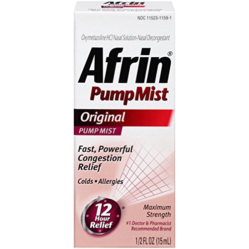 Afrin Original Pump Mist 1/2 oz. Severe congestion pumps mist Oxymetazoline HCL nasal solution-nasal decongestant. No. 1 doctor and pharmacist recommended brand won't drip from nose or down throat. Fast, powerful congestion relief Colds allergies Gives 12 hour relief Maximum strength plus.