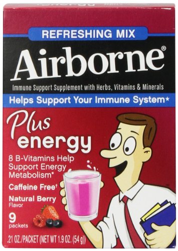 Airborne Plus Energy Immune Support Supplement with Vitamin C, Berry Flavor, 9 Packets.