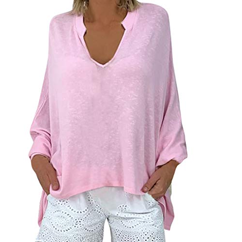 Alangbudu Women Crew V Collar Decor Shirt Batwing Blouse Casual Long Sleeve Baggy Tops Plain Loose High Low Hem Pullover Pink