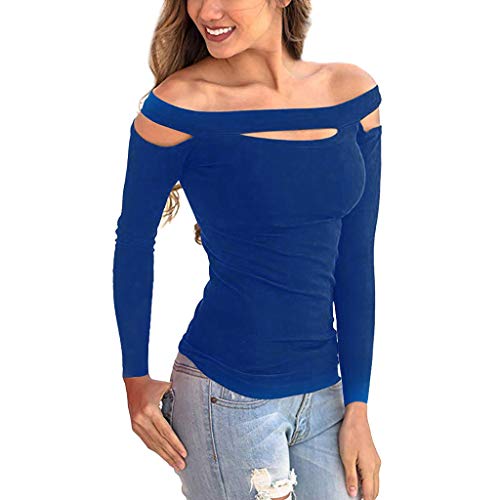Alangbudu Women Off Shoulder Blouse Irregular Hollow Out Shoulder Tops Long Sleeve Slim Fit Shirt Casual Pullover Tunic Blue