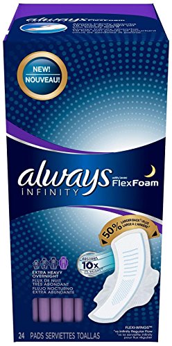Made Like No Other, To Protect Like No Other. Forget pads of the past and try Infinity with FlexFoam - our most amazing pad ever. While regular maxi pads mostly contain fluff, Infinity is made with FlexFoam. It's a unique material that provides up to 8 hours of comfortable, leak-free protection and yet is so soft and flexible you'll barely notice it's there. Try Always Infinity. Until you try it, you won't believe it.;Always Infinity absorbs 10 times its weight yet you barely feel it. Made differently so it protects differently;Incredible Protection for every need
