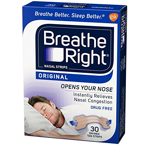 Breathe Right Drug Free Snoring and Congestion Nasal Strips Small Med Original Tan Description: Breathe Better, Sleep Better. Opens Your Nose To: Reduce Snoring. Relieve Nasal Congestion. Drug Free. Breathe Right nasal strips gently open nasal passages so you can breathe through your nose and close your mouth, reducing snoring. Have you ever used a common cold treatment or allergy product to help relieve nasal congestion? Cold treatments and allergy products work for some causes of congestion, such as a cold or flu. But many people prefer a drug-free decongestant for themselves and their children. and medication may not provide enough relief or even be the right treatment, particularly for someone with a deviated septum. When you have a cold or the flu try Breathe Right nasal strips to get fast, effective nasal congestion relief. They gently open nasal passages to give your nose more breathing room naturally. Breathe Right nasal strips use patented reflex technology to gently lift your nasal passages, allowing you to breathe easier. Each drug-free, non-prescription nasal strip consists of flexible, "spring-like" bands. Placed correctly across the nose, the bands gently lift the sides of nose to provide: Nasal congestion relief due to the common cold or allergies. Snoring relief for a better night's sleep. Better breathing for people with a deviated septum. Athletes also use nasal strips to improve their breathing during a workout. Breathe Right nasal strips are ideal for every kind of aerobic exercise. Original Tan. Effective, drug-free, easy-to-apply tan nasal strips provide snoring relief and nasal congestion relief due to colds, flu or allergies. Choose From Two Sizes. Small/Medium (Sm/Med on the package) works best for most (85%) adults and adolescents. Large is recommended for adults with larger noses. Disclaimer These statements have not been evaluated by the FDA. These products are not intended to diagnose, treat, cure, or prevent any disease.
