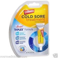 Carmex Cold Sore Treatment. External analgesic. New! TriPlexTM formula. 01 relieves pain & itch. 02 minimizes appearance. 03 immediate results. Advanced technology.