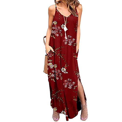 Chaofanjiancai Maxi Dress Women Summer Casual Pockets Strappy Long Dress Sleeveless Beach Cami Split Dress (XL, Red06)