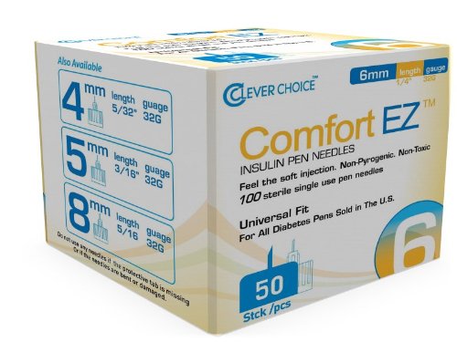 Clever Choice ComfortEZ Insulin Pen Needles 32G 6mm 50/bx fits all pens, is for people of all sizes, has easy injection at all sites, and is more comfortable.