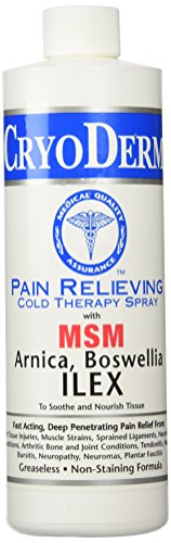CryoDerm pain relief spray is a professional strength analgesic spray to help sooth the pain of: fibromyalgia, arthritis, muscle spasm, Back pain, joint pain, neck pain, elbow pain, TMJ, bursitis and tendonitis. It goes on cool and then almost creates a "mask" helping to block the pain. CryoDerm is great to apply on painful areas before bed to help you sleep. This is the large 'clinic' size used by chiropractors and sport's teams. CryoDerm is fast becoming the favorite topical analgesic amongst arthritis back pain sufferers because it works fast and provides soothing relief. Whether you suffer from muscle sprains & strains, bursitis, tendonitis, arthritis, back aches or other joint pain, you should use CryoDerm pain relieving spray for fast relief. Please understand that this is powerful, yet temporary relief and will not cure your ailment. But, neither does pain medication. CryoDerm pain relief spray is a natural way to achieve relief without taking harmful pain medication. There are several amazing ingredients in CryoDerm that help provide the pain relief. The main active ingredient is menthol, which is derived from peppermint oil. Other ingredients include: Arnica, Boswella, Ilex and MSM. Arnica, which is also known as leopard's bane has a bright yellow flower that blooms in the summer.