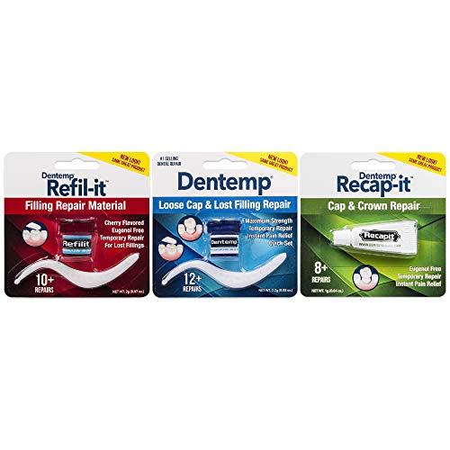 DENTEMP: Dentemp is clinically proven to temporarily repair loose caps and crowns and replace lost fillings, while providing instant pain relief. It is easy to use, and the formula is safe and strong. REFILIT: Dentemp Refill-it Filling Repair Material provides fast relief of pain and discomfort until you can see your dentist. Dentemp Filling Repair Material is a pleasant cherry taste, safe and effective. RECAP-IT: Recap-it Cap and Crown Repair is a convenient liquid that quickly reattaches loose caps and crowns. The fast-acting formula cures fast, so you can eat on it in 60 minutes.