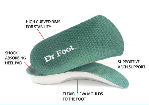 Dr Foot Pro insoles are designed to fit into normal shoes, lateral cutaway provides an easy fit for almost any type of shoe. The wearer will adjust quickly and find the device comfortable to wear. This insole provides the functionality and stability of the full length insole but can be placed into all types footwear for men and women. They help reduce stress at key weight points, keep each foot properly aligned and cradle and stabilize your heels. A strategically placed heel insert made of poron foam absorbs the pounding foot shock of each step. Dr Foot Pro 3/4 length insoles provide the support you need to insure prevention and treatment of sports injuries and foot pain such as bunions, ball of the foot pain, flat feet, neuroma, over pronation, heel pain and many other conditions.