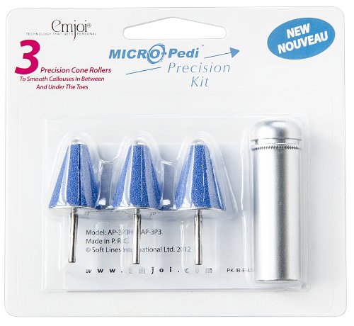 Quickly remove calluses at home with the salon-quality Emjoi Micro-Pedi Precision Accessory Kit Now you can use your Emjoi Micro-Pedi to remove calluses and corns in hard-to-reach areas, like between and under your toes. Place one of the three cone tools in the roller of the Micro-Pedi. Battery-powered rotation action spins the cone tool at 1800 RPM, helping eliminate the effort required to remove calluses and corns for salon-quality foot care at home. Note: Emoji Micro-Pedi (50545) unit not included.