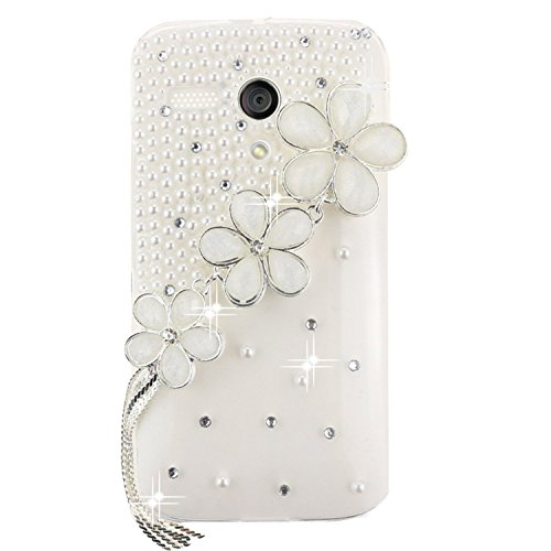 EVTECH(TM) 3D Handmade Crystal White Blossom Silvery Tassel Rhinestone Diamond Bling Cover Hard Clear Case for Moto G (XT1031, XT1032, XT1033, XT1034) (100% Handcrafted)