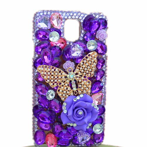 EVTECH(TM) 3D Handmade Violet Crystal Flower Pearl White Butterfly Rhinestone Heart Diamond Design Hard Cover Case for Samsung Galaxy Note 3 SM-N9000 (Purple)