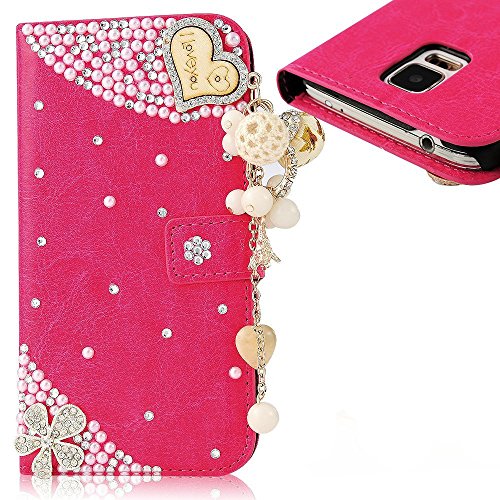 EVTECH(TM) for Samsung Galaxy Note Edge N9510 3D Handmade Bling Crystal LOVE Heart Pendant Sparkle Glitter Rhinestone Diamond Flowers Red PU Leather Wallet Type with Magnetic Clasp Credit Card Holder Design Folio Case Cover