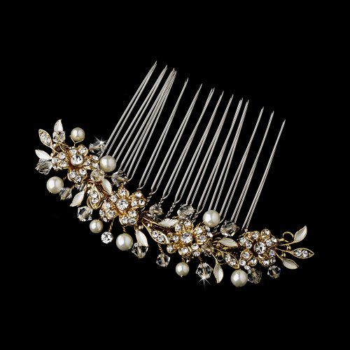 This artistically crafted comb will truly glitter on your wedding day! Luminescent ivory faux pearls, stunning 14 karat gold plating, sparkling clear rhinestone flowers and fabulous Austrian crystals prance along this wonderful bridal comb. This is a charming addition to your already gorgeous bridal hairstyle!