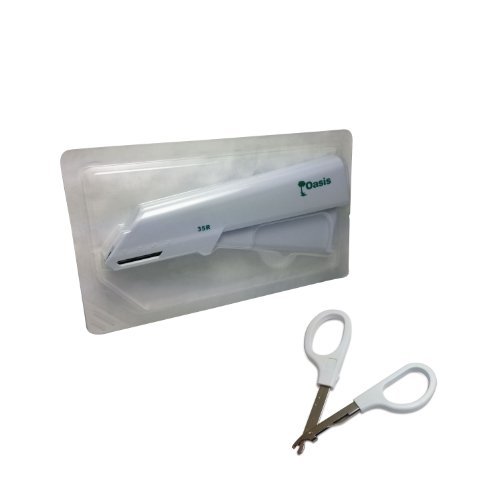The Oasis wide skin stapler is affordable and simple. It fits comfortably in your hand to enhance control of skin closure and also reduces surgery time. Lever action staplers are the most popular design on the market, along with a distinctive staple shuttling feature greatly reduces track friction, a primary cause of jamming. Other features include a short trigger stroke for ease of use and nonstop feed, angled head allows visibility of incision to ensure precise staple placement during operation, arrow indicator assists in accurate staple alignment. Staple count indicator allows you to view staples remaining to help minimize waste. Staple lines are more likely to prevent leakage of blood or air. Wide Staples measure 6.5mm x 4.7mm. Versatile stapler remover allows for fast and easy removal of surgical skin staples with minimal discomfort to the patient. Each sterile, single-use instrument is shipped ready-to-use in sealed plastic packaging that's easy to open. Effectively removes staples in same direction they were embedded during surgery. Guaranteed to remain sterile until the expiration date, unless the package has been opened or damaged. Scissors-style for precise handling. Both scissors and tweezer style can be used for any procedure