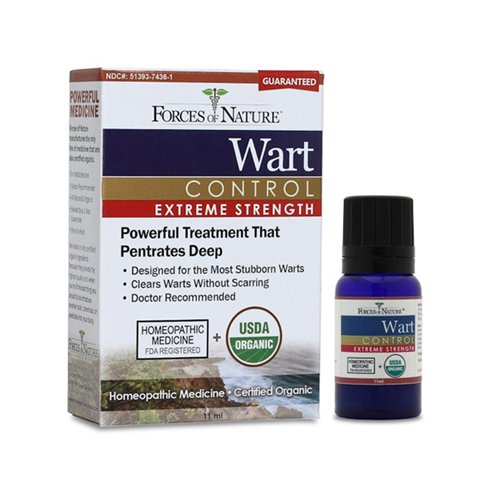 Maximum Strength Wart Treatment for Resistant Strains This breakthrough topical natural warts treatment is designed to rapidly eliminate the most resilient warts without skin damage. Wart Control Extreme Strength is formulated to: Deliver our most ferocious wart treatment available Contain the highest potency of thujone and triterpenes Penetrate deep into skin tissue to combat even stubborn roots Contain no toxic acids or chemicals Heal damaged skin This is our most potent wart remedy. The potencies of the active drug compounds have been increased from the Extra Strength treatment to combat even the most stubborn strains of warts. Botanicals rich in polyphenols, have also been generously blended into this extreme strength remedy. The lipophilic formula absorbs deep into skin tissue, where it works on a cellular level to effectively treat even the most resistant strains of warts and help heal damaged skin. Extreme Strength Wart Control is highly unique. It is specifically formulated to combat the toughest strains of warts. Its power lives up to its name. Results are backed by our 1-year money back guarantee. This is a proprietary blend formulated and manufactured by Forces of Nature. Results are generally experienced in 1-3 weeks.
