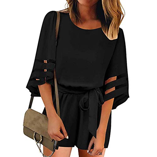 Handyulong Womens Rompers Summer 3/4 Sleeve Mesh Panel Drawstring Casual Playsuit Shorts Rompers Jumpsuit for Teen Girls Black