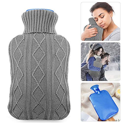 Hot Water Bottle with Knit Cover, UBEGOOD Rubber Transparent Hot Water Bag, Good for Pain Relief (2 Liters, Blue/Gray)