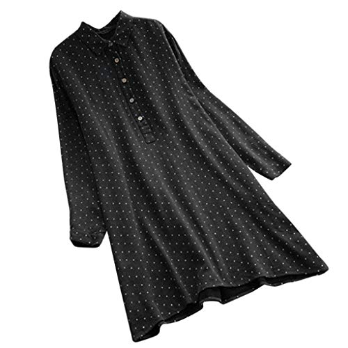 iDWZA Valentine's Day Womens O-Neck Polka Dot Lapel Button Loose Long Sleeve Vintage Shirt Dress(Black,XL)