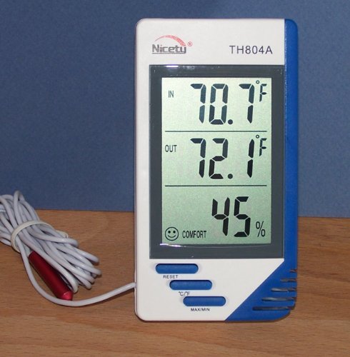 This is a great thermometer hygrometer combination, in addition it can measure the outdoor temperature with a temperature sensor on a 5 ft cable.Most experts recommend an indoors air humidity level between 40 and 60% as most comfortable. Too dry air can strain the respiratory tract, while high humidity levels promote the growth of mold and germs in the walls.Many people use humidifiers during the dry winter months. But does your humidifier work right? Does it provide enough moisture, or too much? Measure it using the Humidity Meter TH804A!This meter will allow you to check the humidity level and temperature quickly. The sensor is located at the lower edge of the meter, for best air circulation and fast readings. Place the meter in a room and after 3-5 minutes it will give you a stable reading of the current conditions. You then can use the readings to adjust the humidifier. If the meter reads 'dry' it might be good to switch it on, if it reads 'wet' you should switch it off to avoid mold.