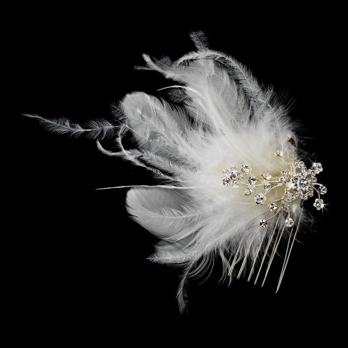 This charming feather fascinator sprays to the right side of the comb from a floral rhinestone arrangement. A beautiful choice for the modern or vintage bride.