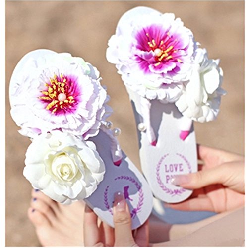 KAKA(TM Women's Fashion White Flower Rhinestone Glitter Studded Crystal Thong Sandals Flip Flops Flat Shoes Sandals(39-40)