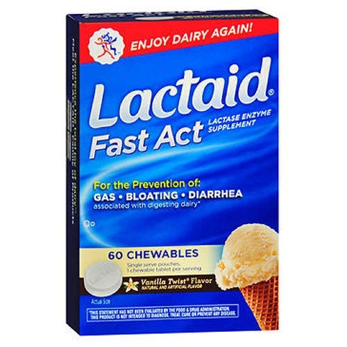 LACTAID Fast Act Chewables start working when you take them with your first bite or sip of dairy food, helping prevent the gas, bloating, and diarrhea that many people experience after eating foods containing dairy. With the natural lactase enzyme, this dietary supplement helps prevent symptoms associated with lactose intolerance by breaking down milk sugar (lactose), so dairy foods are easier to digest. These tasty chewables start working with your first bite of dairy. Certified kosher, LACTAID Fast Act Chewables have a smooth Vanilla TWIST Flavor. This package comes with 60 single-dose pouches.