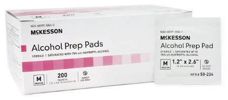 4 Pack of Alcohol Prep Pad McKesson Isopropyl Alcohol, 70% Individual Packet Medium, 1.2 X 3.5 inch Sterile, Box of 200 For topical cleansing prior to injection prep or venipuncture 2-ply design for effective use and resistance to tearing Saturated with 70% v/v Isopropyl Alcohol Ideal for use as a general first-aid solution and in the administration of blood tests and insulin or heparin injections Pre-moistened, soft, nonwoven material maintains a moist state for gentle, yet effective, use Single-use, disposable pads - perfect for users requiring on-the-go injections Individual pads enclosed in foil packages to maintain sterility for single use Not Made with Natural Rubber Latex