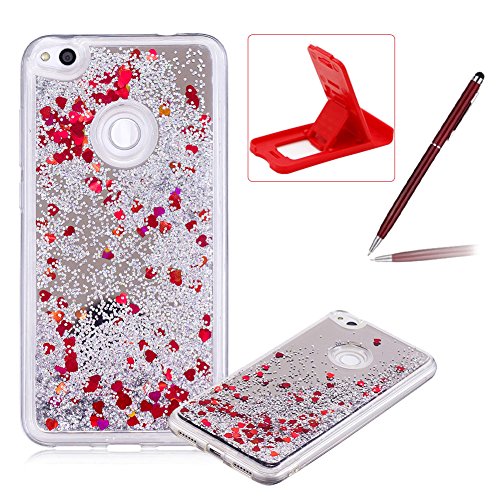 Mirror Liquid Case for Huawei P8 Lite 2017,Soft Bumper Clear Cover for Huawei P8 Lite 2017,Herzzer Luxury Slim Red Glitter Quicksand Love Hearts Sequins Back Case