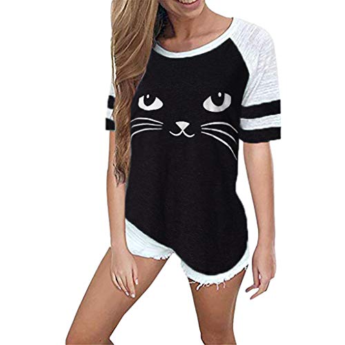 Mlide Cute Cat Print Top,O-Neck Strip Sleeve T-Shirts,Womens Spring Summer Tops Short Sleeve Blouse(Black,Large)