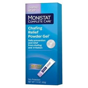MONISTAT Complete CareTM Chafing Powder Gel® is a daily prevention and relief from chafing and irritation. • Combines the protective benefits of lotion and powder • Helps reduce the appearance of redness after shaving or waxing in the bikini area • Contains a skin protectant ingredient that creates a smooth protective barrier on the skin • Forms a breathable moisture control barrier to fight friction • Protects skin from uncomfortable irritation caused by moisture, heat, movement and shaving • Provides on-the-go daily prevention and relief from chafing and irritation of skin in intimate delicate areas such as: o Inner thigh o Bikini area o Under arms o Breasts Other Chafing Gel features: • Non-greasy