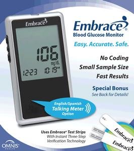 Omnis Embrace No Code Talking Meter provides accurate results in just 6 seconds with just a small, painless .5mL blood sample. No Code Technology delivers a more accurate result with less potential for error. Includes a 300 test memory capacity, memory recall, a large display screen and auto on/off. Allows for alternate site testing and has a lifetime warranty.