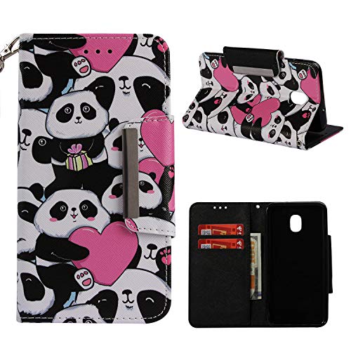 Ostop Painted Leather Wallet Case for Samsung Galaxy J3 2018,[Kickstand Feature] Pink Heart Panda Printed Pattern Magnetic Flip Cover with Card Slots and Wrist Strap Shockproof Shell