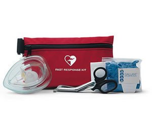 The Fast Response Kit contains tools and supplies typically needed for patient care and personal protection. Kit includes two pairs of nitrile gloves, one CPR mask, oneparamedic scissors, one prep razor, one large reinforced papertowel. All items contained in a zippered pouch that attaches tothe AED carrying case.