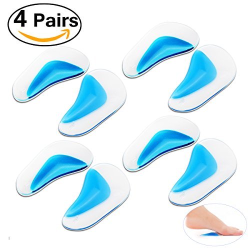 This item is a pack of 4 pairs of foot correction insoles made of high grade medical silicone material. It is a multi-functional correction pads for flat foot, strephexopodia, X-type legs and pigeon toe. The soft texture provides cosy, comfortable wear. It easily stick to any shoes and fit the feet closely. The pads balance the sole force and relieve the pain through supporting the arch. It is washable and reusable.