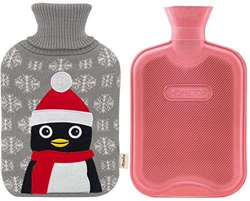 Premium Classic Rubber Hot Water Bottle and Cute Animal Embroidery Knit Cover (Penguin/Gray)