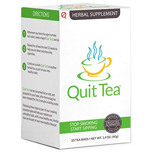 Quit Tea Stop Smoking Tea. Description: Stop Smoking - Start Sipping. Natural Quit Smoking Aid. Quit Tea is a blend of herbs and spices that is intended to replace the habit of smoking with drinking herbal tea. Quit Tea helps with some of the common withdrawal symptoms. Quit Tea Will Help: Reduce Anxiety and Stress. Increase Energy and Suppress Appetite. Detox Body and Lungs. Replace The Habit. Part of A Healthy, Smoke-Free Lifestyle. Free of Caffeine, nicotine and lobelia. Disclaimer These statements have not been evaluated by the FDA. These products are not intended to diagnose, treat, cure, or prevent any disease.