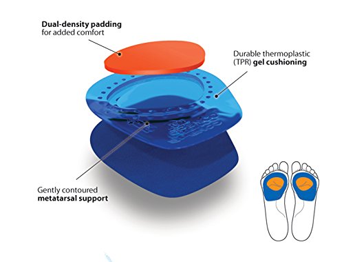 Specialized dual density Spenco® TPR Gel supports the ball of the foot and provides maximum comfort. Thermoplastic Rubber combined superior cushioning and energy return for ultimate performance. The antimicrobial top cloth helps keep the Metarsal cushion in place and eliminate odor-causing bacteria. The Slip-Resist™ design helps keep the material arch cushion in place. One size fits all.
