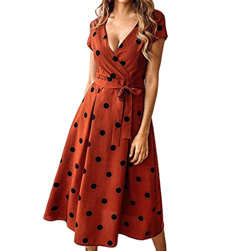 SSYUNO Women's Summer Mid Sundress Sexy Short Sleeve Polka Dot Print Wrap V-Neck A-Line Beach Party Dress Whit Belt Red