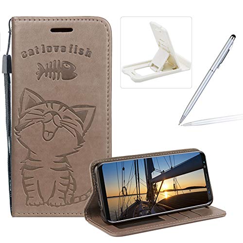 Strap Leather Case for Galaxy S8,Gray Wallet Flip Case for Galaxy S8,Herzzer Elegant Classic Solid Color Magnetic Closure Cute Fish Cat Printed Stand PU Leather Case with Soft TPU