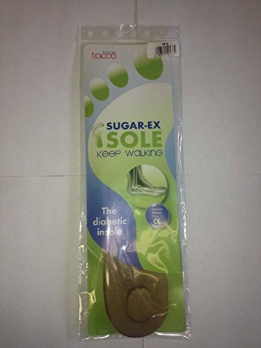Tacco Sugar-Ex Diabetic Insoles. The patented insoles functions as a "foot pump" and promotes an increased flow of blood in the lower extremities. The comfortably integrated pressure points activate the foot with every step to promote blood flow through the foot, ankle, and calf. The middle of the insole is made from a special memory foam. This unique foam provides optimal comfort and encourages the natural regeneration of the foot. Through the "Memory Effect", the foam always returns to original form. The special shape of the insole relieves the feet of particularly sensitive areas, which tend to be neglected. The pressure that radiates back into the foot with every step can be significantly minimized. In addition, the orthopedic elements work to support the foot and reduce the emergence of damage caused by diabetic neuropathy. To prevent foot skin infections, the insole has been equipped with a skin-friendly velour surface with an enduring antibacterial effect to counteract infections. The Diabetic PED insole is clinically tested. The Seiter clinic, a clinic for vascular diseases, and the Institute of sports and sports science of the University of Karlsruhe, have confirmed the effectiveness of the insoles. The blood circulation in the foot in the foot is increased by an average of 26%. How to use: This insole is very slim and fits into every shoe. Can also be used in thong sandals. Simply take of the small part at the perforation. Can be used at both diabetes type 1 and 2.