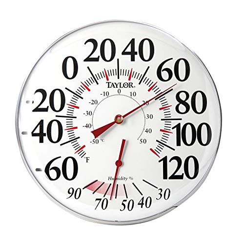 Keep up with weather conditions with the Taylor Precision Products Humidiguide Dial Thermometer (12-Inch). Measure indoor temperatures or outdoor temperatures with humidity simultaneously with this thermometer/hygrometer. With all-metal construction, this gauge works well inside the home or on a patio or porch. Large digits and markings printed in bold black and red are easily visible from afar. Read temperatures from -60 to 120 degrees Fahrenheit (-50 to 50 degrees Celsius) and relative humidity levels from 20 to 90% with the dial's bright red pointers. Mount the thermometer/hygrometer indoors or outside with the built-in mounts on the rear.