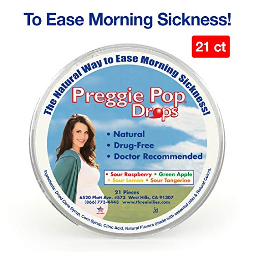 Three Lollies Preggie Drops Morning Sickness & Nausea Relief during pregnancy Safe for pregnant Mom & Baby Gluten Free Four Flavors: Lemon, Raspberry, Green Apple, Tangerine 21 Drops
