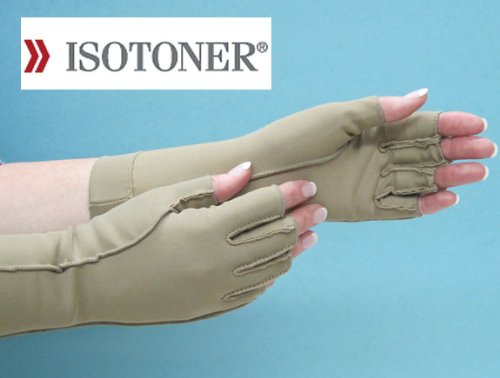 These isotoner Fingerless Compression Gloves are a comfortable option for anyone that needs moderate compression--approximately 23-32 mmHG. This tailored glove is designed so the seams are on the outside for increased comfort and to help patients with edema or similar conditions. Also, the gloves are made of a latex free synthetic nylon and spandex material to feel soft and smooth against your skin.