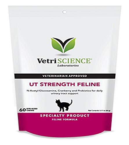 UT Strength Feline has been formulated to support urinary tract health and can be used long term with those animals who are predisposed to UT issues and crystals. This veterinarian formulated product includes D-Mannose, GanedenBC30 and cranberry extract. These ingredients work together to promote normal function of the urinary tract system. UT Strength from VetriScience is a chicken liver flavored soft chew that even finicky cats love.