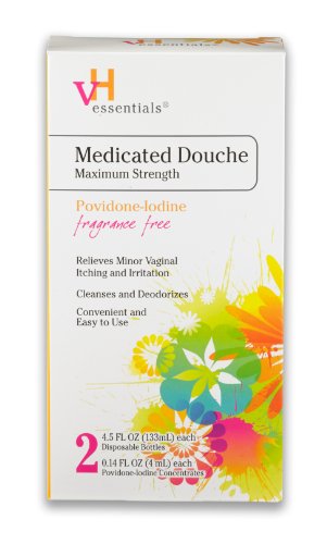 The vH essentials Povidone-Iodine Disposable Douche offers prompt relief of minor itching and irritation. This maximum strength douche cleanses and deodorizes. Convenient and easy to use this twin pack offers two pre-measured Povidone-Iodine packets, two bottles of purified water and two individually wrapped nozzels.