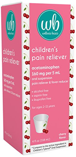 Wellness Basics Children's Pain & Fever Relief Acetaminophen Cherry Liquid (4 oz) reduces fever and pain associated with the common cold, flu, headache, sore throat and toothache. Its pain-fighting formula compares to the active ingredient in Children's Tylenol Oral Suspension and is free from alcohol, aspirin and ibuprofen. Suitable for children 2 to 11 years of age. Proudly manufactured in the U.S.A.