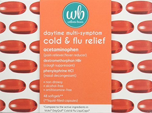 Wellness Basics Multi-Symptom Daytime Cold & Flu Relief Softgel (48 count) combines acetaminophen, dextromethorphan HBr and phenylephrine HCI to relieve common cold and flu symptoms without making you drowsy. These include minor aches and pains, headache, sore throat, nasal congestion, fever and cough due to minor throat and bronchial irritation. Its cold-and flu-fighting formula compares to the active ingredients in Vicks DayQuil LiquiCaps and is free from alcohol, antihistamine and pseudoephedrine. Proudly manufactured in the U.S.A.