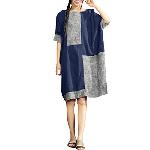 Womens Casual Linen Dress Loose Fit Half Sleeve Patchwork Boat Neck Plus Size Dresses M-4XL (XXXXL, Navy)